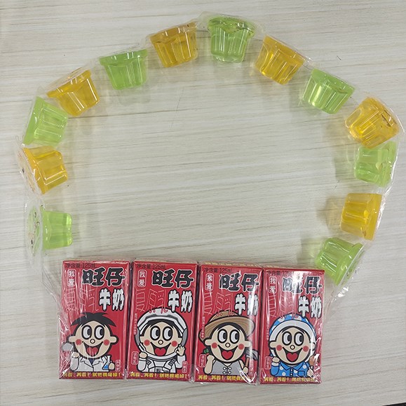 每位同事的工位都上了放了旺仔牛奶和果凍做成的小包包,