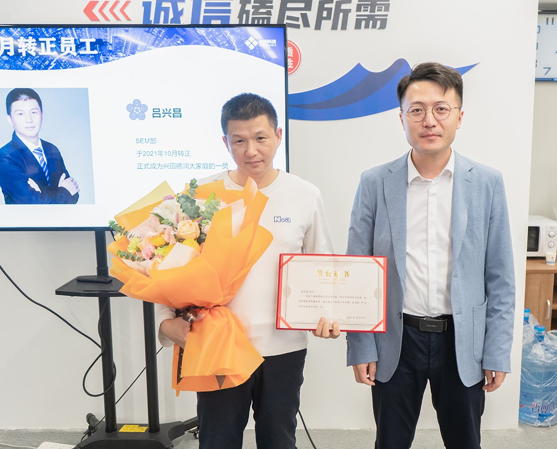 緊接著是員工轉(zhuǎn)正儀式,轉(zhuǎn)正員工上臺領(lǐng)取屬于他的鮮花和榮譽證書,并講述了他正式成為一名興田人的驕傲與自豪。
